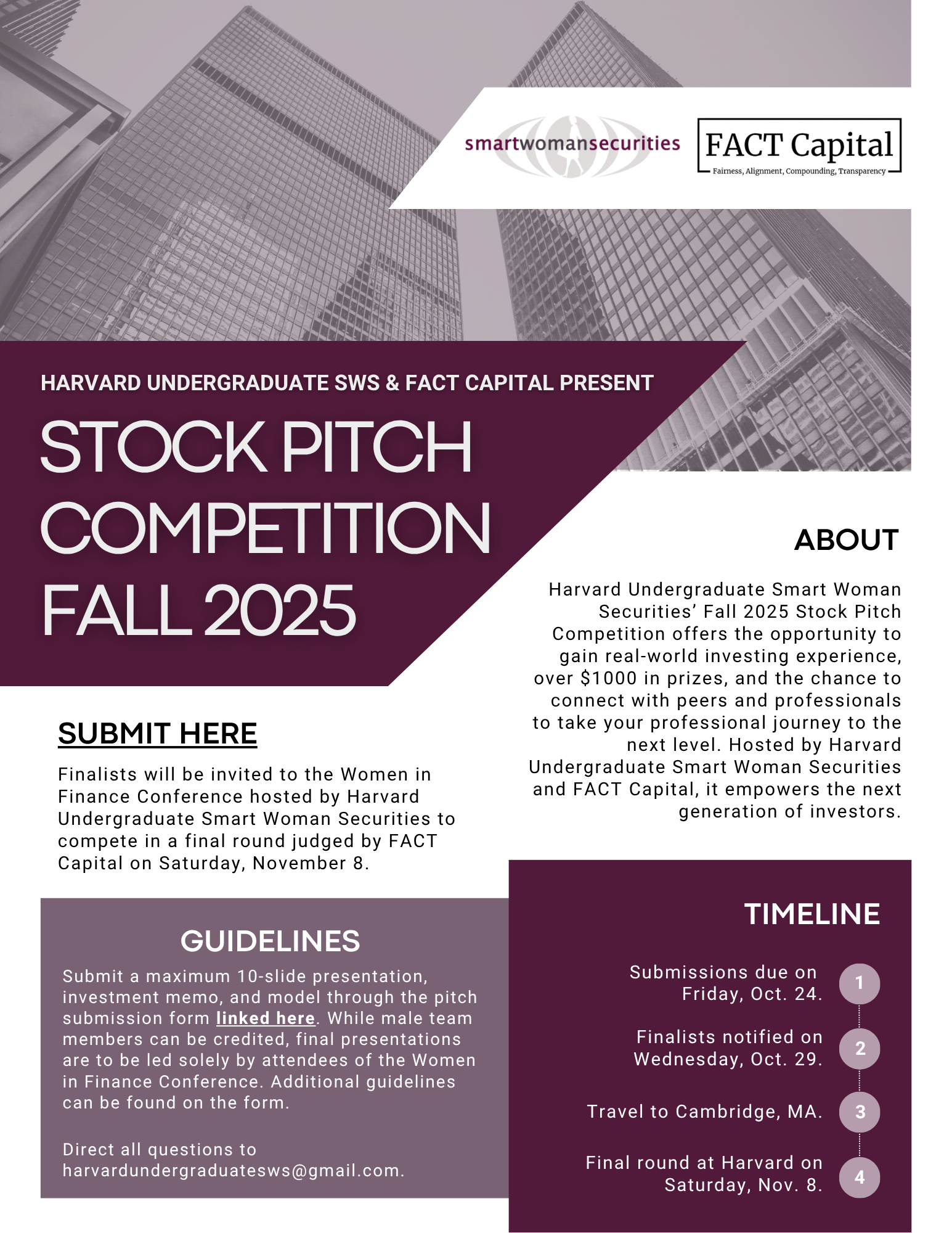 Three finalists will be selected to present in-person during the Women in Finance conference, judged by representatives from FACT Capital on Saturday, November 8th.